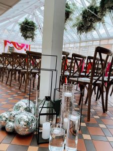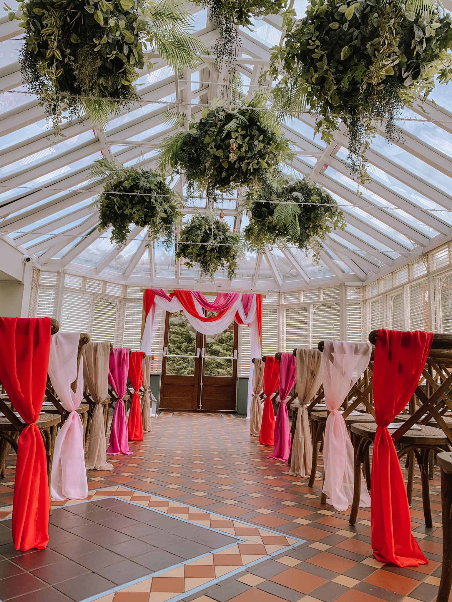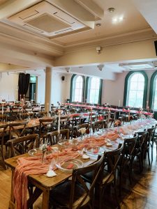 Jade and Jack had opted for all pinks for their wedding styling. Jade envisioned a variety of pinks so we pulled in the colour through the chair drapes, styling only the aisle end chairs and used lots of draping on the archway at the end of the aisle. The pinks tied in with the decorative flooring at the Faversham and the greenery hanging from the ceiling created the exact vibe that the bride and groom were looking for.