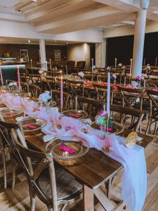 In the reception room we dressed the trestle tables with a variety of pink table runners, taper candles and charger plates. Jade brought along her own table florals and place names and the room looked simply fabulous.