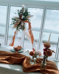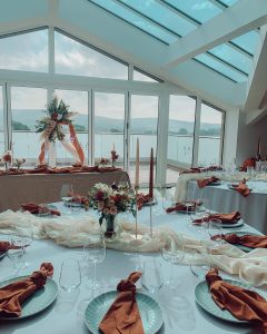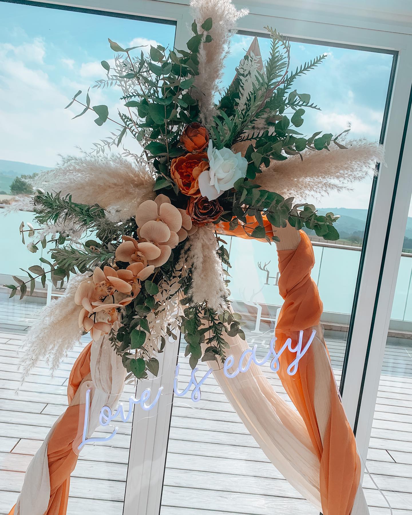The reception room was a blank canvas, white linen on the tables and a few glasses ready to be laid out. The sun was shining through the glass roof and the room was so bright and airy. I styled the sweetheart table first, a dark beige linen tablecloth draped over the table paired with a terracotta drape and some bud vases with some beautiful flowers from Walter and Blossom. Behind the table I used a triangular arch with a personalised neon sign saying ‘Love is Easy’ which tied in with the table plan theme. I added orange and cream draping with another eucalyptus and pampas grass arrangement and was super pleased with the end result.